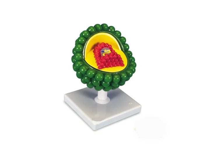 Մոդելը ցույց է տալիս վիրուսի արտաքին և ներքին կառուցվածքը՝ լիպիդային ծրար՝ սպիտակուցային կառուցվածքներով և միջուկ՝ գենետիկ նյութով: Վիրուսի արտաքին ծրարն ունի բնորոշ կառուցվածք, ինչը հնարավորություն է տալիս ցուցադրել նրա կառուցվածքի առանձնահատկությունները։ Միջուկը պարունակում է պայմանական գենետիկական նյութ։ Պատրաստված է պլաստմասից, ներկված վառ գույներով, տակդիրի վրա։ Մոդելի չափը առնվազն 30 սմ է
